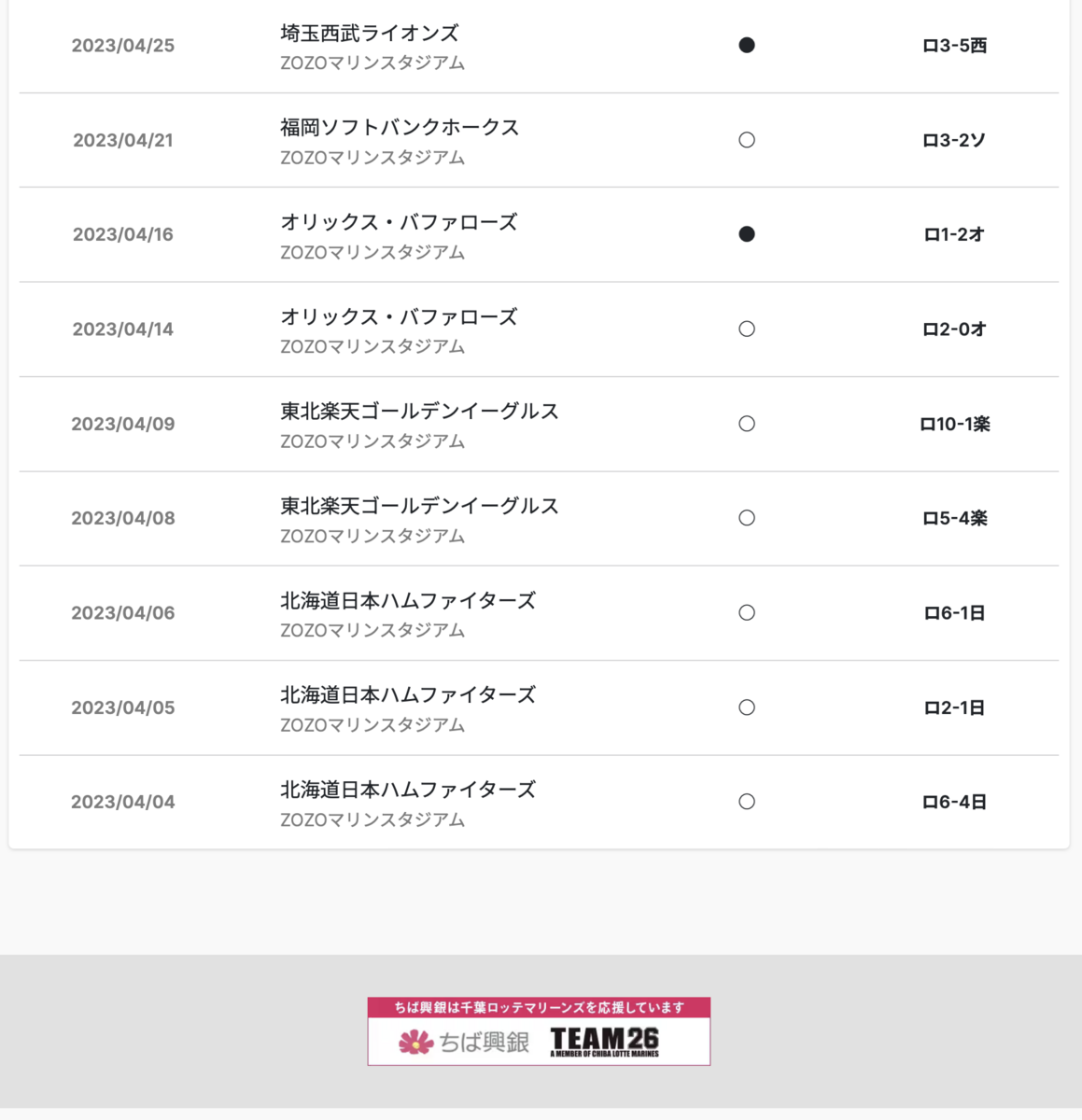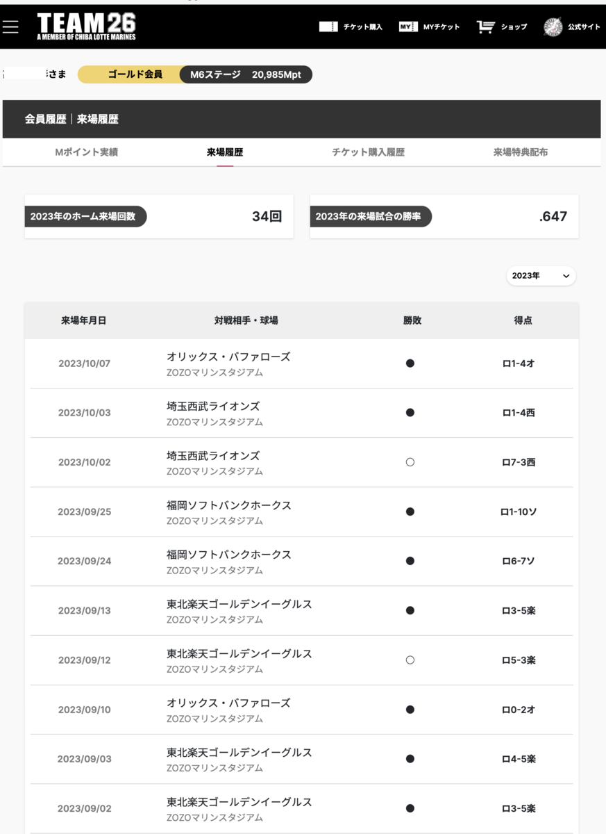ZOZOマリンスタジアム観戦 34試合22勝12敗0分 勝率0.647
