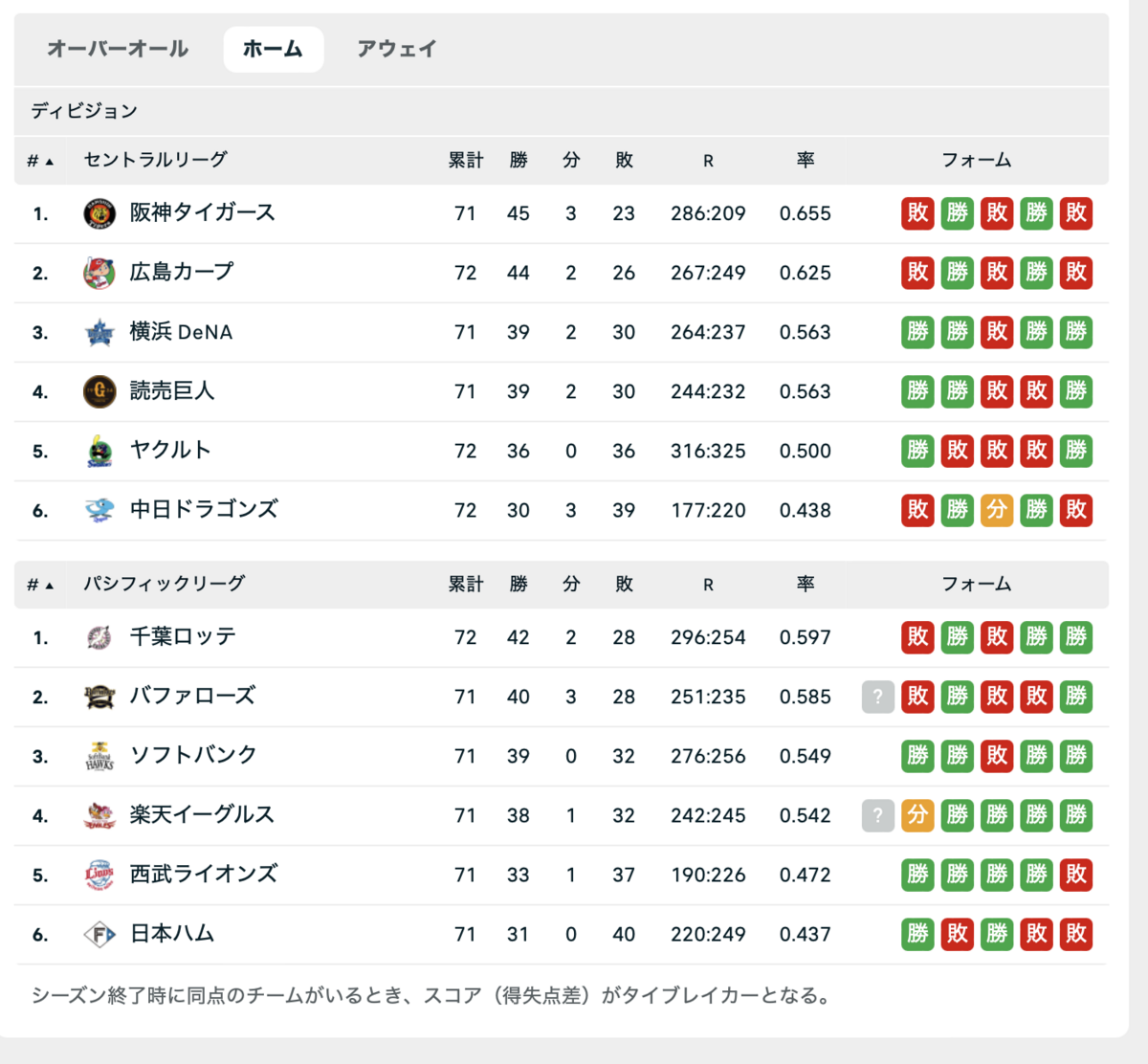 チーム自体のホーム開催試合 72試合42勝28敗2分 勝率0.597