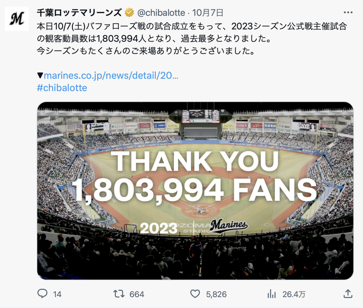 今年のマリーンズはホーム開催試合がパ・リーグ1位の勝率、アウェイ開催でパ・リーグ6位と見事な内弁慶っぷりという結果だった。好成績は観客動員数新記録達成の後押しもあったのかな?